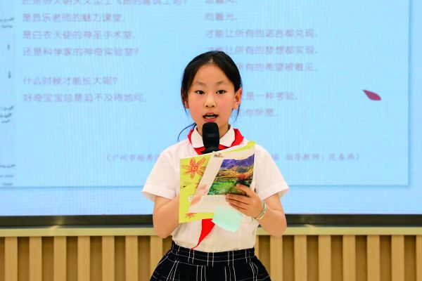 来自越秀区中星小学的陈柔伊同学和越秀区云山小学的刘星瑶同学分别分享了自己发表在市队刊《都市人·成长》上的原创文章《口袋公园“装”满欢笑》和原创诗歌《长大》,以细腻笔触讲述城市微更新中的温暖故事及倾诉对成长的深刻感悟。