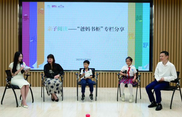 “爸妈书柜”亲子阅读分享环节备受现场家长瞩目。海珠区绿翠小学的陈俊滔同学及家长陆敏君、黄埔区东荟花园小学的曾皙珺同学及家长曾广卫走上讲台,父母与孩子携手讲述家庭藏书故事、分享共读心得,生动诠释了阅读作为情感纽带的重要作用,让书香在家庭中自然流淌。