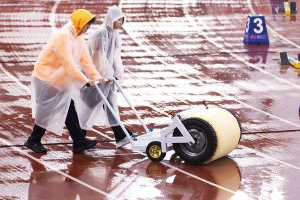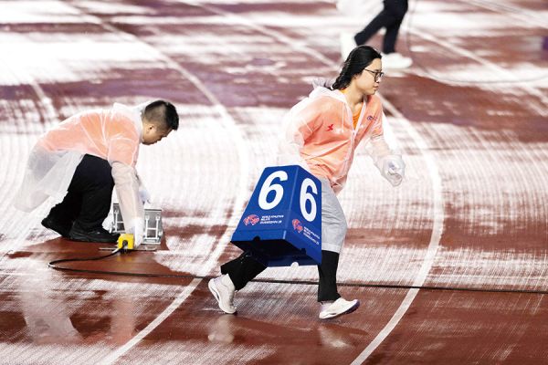 志愿者在赛前清理跑道(吴洁芝供图)