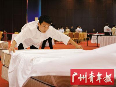 在与全市众多客房服务高手的封闭训练和角逐中,江思铭年纪最轻,经验最少,却最终在选拔赛中击败竞争对手,获得代表广州市出战广东省旅游饭店服务技能大赛的席位。