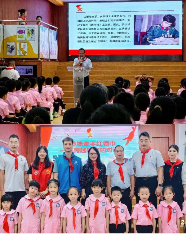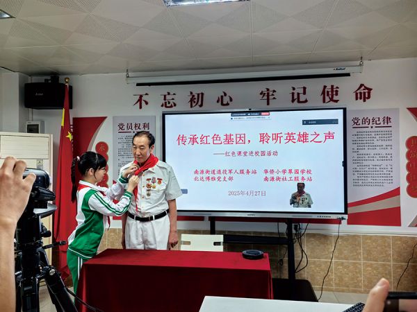在荔湾区华侨小学汇龙学校举行的少先队入队仪式上,南源街道退役军人服务站、社工站携手荣誉指导员罗瑞雄走进校园。在鲜红的队旗下,罗瑞雄亲手为新队员佩戴红领巾,仔细整理衣领,并以自身经历为孩子们讲述烽火岁月里的战斗故事,以及和平年代的奉献担当。一句句饱含忠诚信念与家国情怀的谆谆寄语,让新队员们目光坚定,标准的少先队队礼中满是崇敬。