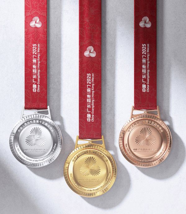 奖牌缎带设计以“中国红”为基调,缎带图案采用“三花映牡丹”主题花纹,将牡丹花、木棉、紫荆花和莲花融入其中,比喻三地同心协力、绽放光彩相互辉映,尽显中式美学的典雅韵味。