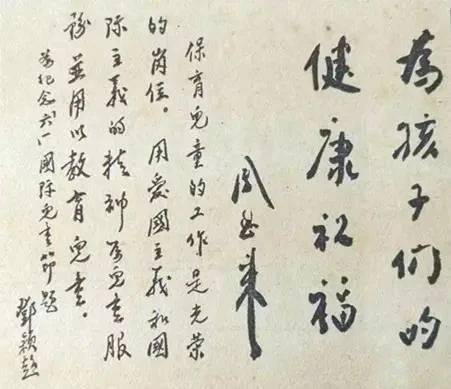 周恩来与邓颖超夫妇为纪念“六一”国际儿童节题词。周恩来写道:“为孩子们的健康祝福”,邓颖超则题词为“保育儿童的工作是光荣的岗位,用爱国主义和国际主义的精神,为儿童服务并用以教育儿童”。