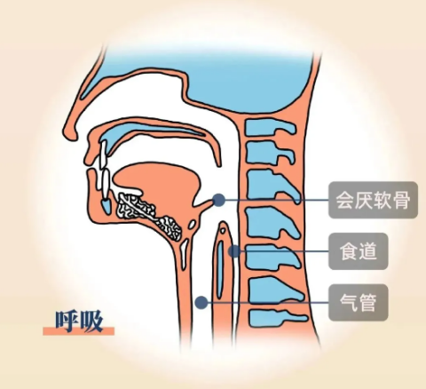平时,“会厌”会保持打开状态,以确保气体流通。但在吃东西时,“会厌”会盖住气管,防止食物“走错路”。然而,如果我们一边吃饭一边说话,或者不小心被呛到了,“会厌”便会突然被抬起,此时若食物继续下落,就会进入到“大门敞开”的气管中。