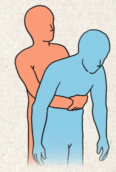 救助者应站在被卡喉者的身后,给他一个后背式的拥抱。“剪刀”即一手的两根手指放在卡喉者的肚脐上;“石头”即另一只手在两根手指上方握拳,大拇指顶住其腹部;“布”即用“剪刀”手包住“石头”并握紧,快速向内、向上冲击,重复动作,直到被卡喉者将异物吐出。