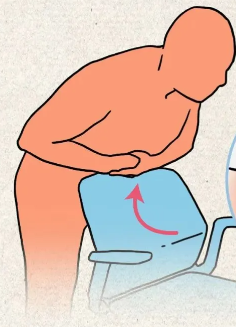 若不幸,卡喉者是自己,身旁又无人可帮助时。我们可握紧自己的拳头,将拳头靠在椅背上或桌边,对准肚脐上方,使劲撞向拳头;也可以直接将腹部撞击椅背。用力的方向,一定是向内、向上的。不过,当吐出异物后,建议立刻前往医院检查,检查方才的急救活动是否有导致内脏损伤。
