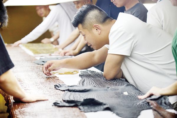学员在中国皮具箱包博物馆欣赏制皮原材料