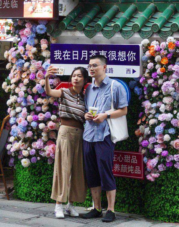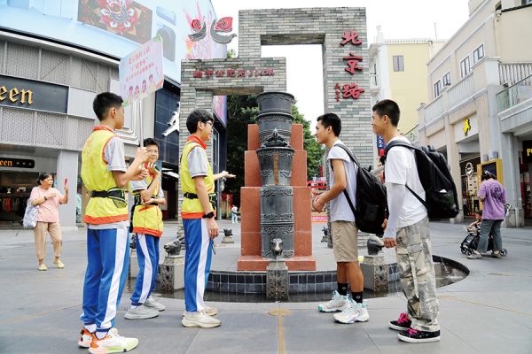 北京路步行街上,听学生志愿宣讲员讲解千年古道的故事 林乐峰/摄