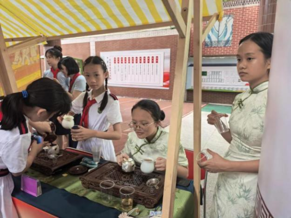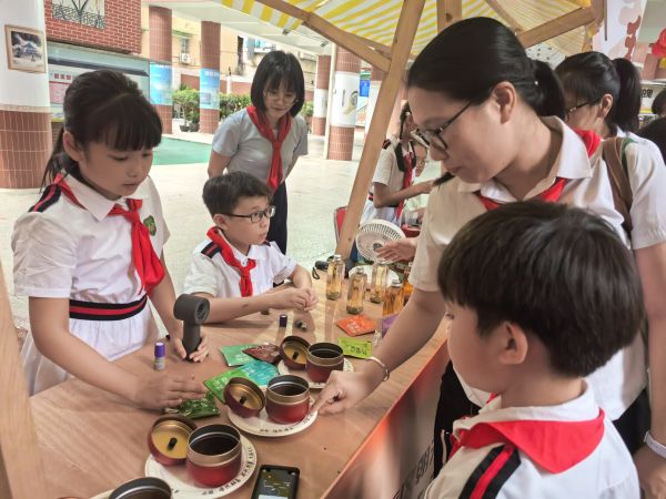 我和伙伴们都拥有广东人的传统美德——喜欢“请人喝茶”,因此我们设置了有趣的茶文化问答环节,同学们回答正确即可品尝上一杯香浓的英德红茶。我和伙伴还沉浸在分享茶文化知识的快乐中,为此还设计了茶叶成分与功效的连线游戏。听了我们的讲解后,若能将茶叶的成分与对应功效连线,便可完成奖励图章。