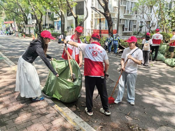 在车陂街道旭景社区,青联委员马然和梁楚苗等人带领广州南方测绘科技股份有限公司等3家企业共23名青年集结车陂街道旭景社区,开展“两热”防控环境卫生整治专项行动,深入社区卫生死角、垃圾堆放点进行全面清洁整治,精准部署村居防控策略。