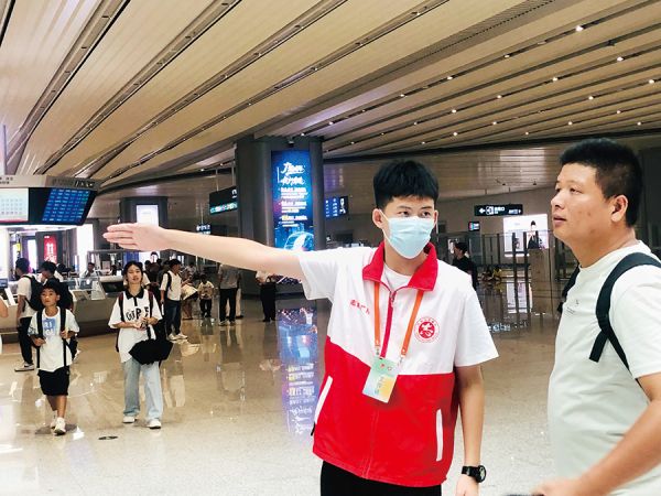 暑期,广州白云站客流压力增大,作为亚洲最大的火车站综合枢纽之一,促进会与白云站青年志愿服务队强化服务,预计4400余名志愿者进驻广州白云站为旅客保驾护航。连续两年参与志愿服务的范睿恩,如今已可以从容应对旅客咨询。