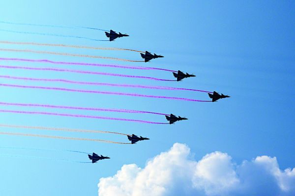 凸显纪念主题,飞机通过悬挂旗帜和标语、组成特定数字编队队形,宣示中国人民爱好和平、人民军队捍卫和平的坚定立场和决心。