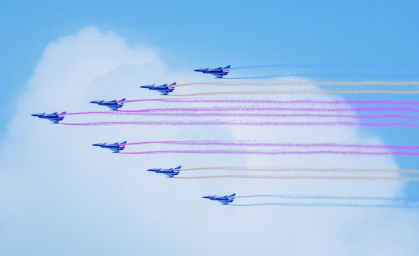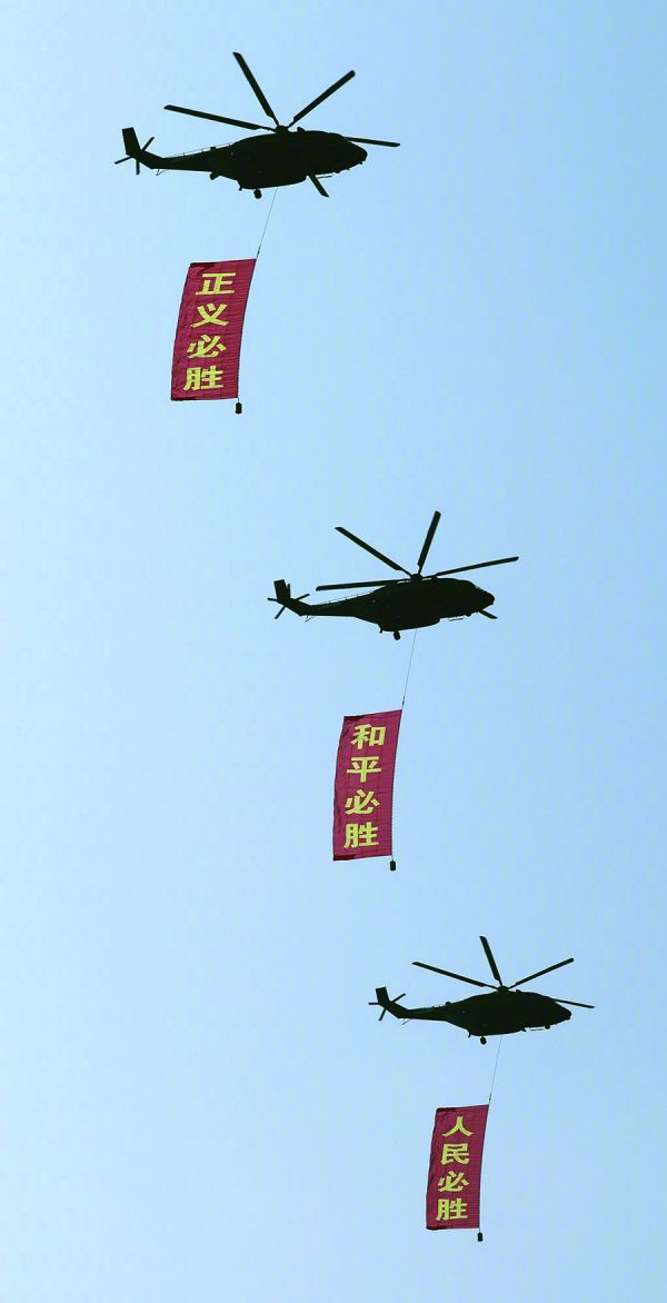 上万名受阅官兵、数百台(套)地面装备、百余架战机,编成45个方(梯)队庄严接受祖国和人民检阅——在党旗、国旗、军旗引领下,受阅方队擎军兵种军旗和武警部队旗集中亮相,这是我军力量结构新布局在阅兵中的首次集中展示。80面抗战英模部队荣誉旗帜组成的战旗方队,引领装备方队以实战化联合编组、分7个作战群接受检阅。预警侦察、远程打击……空中梯队按照模块化、体系化编组,基本涵盖我军现役主战机型。这次受阅的武器装备全部为国产现役主战装备,多数为首次亮相。分列式尾声,7架战机划出14道彩烟,寓意中华民族14年可歌可泣的抗战历程,象征14亿多中国人民奔向强国复兴的绚丽前景。