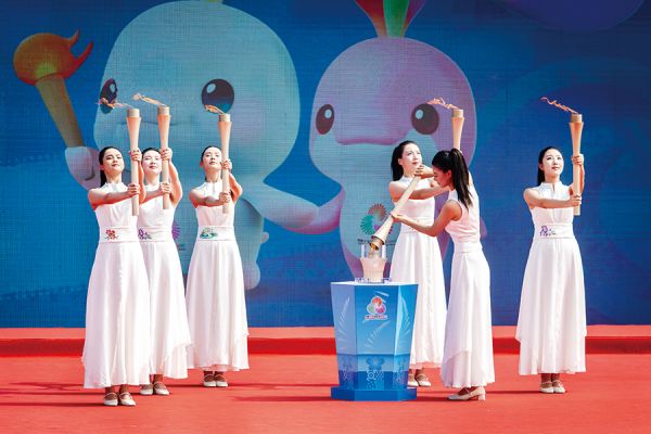 采火少女在“源火”台引燃手中的采火棒 苏宏斌/摄