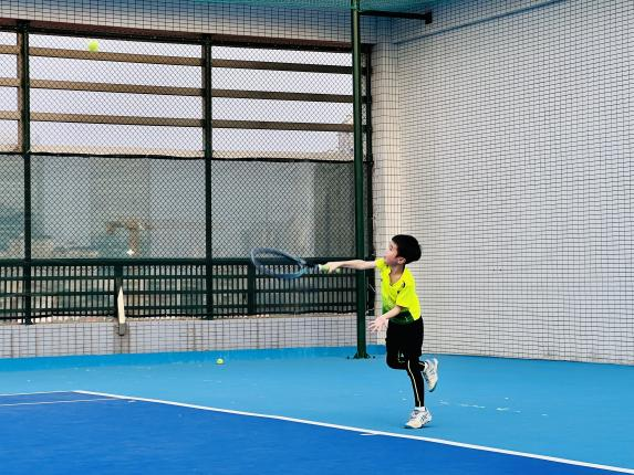 我的网球教练时常提醒我们:上场前一定做“小兔子蹦”和拉伸操热身。网球是一项室外运动,烈日下要记得戴遮阳帽;挥拍时切忌抬肘太高,不然胳膊会发出“嘎吱”响;捡球时要学用小青蛙蹲姿,可别学长颈鹿突然弯腰,小心闪到腰!最后,切忌用球拍打蚊子,不然球拍会“伤心”。