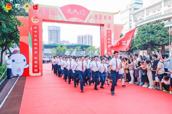随后,身着整齐校服的高三学子们,精神抖擞地依次走过铺着红地毯的成人门。成人门两侧“万千日夜砺双肩 定展宏图”“十八春秋磨一剑 强国有我”的标语格外醒目,传递出对青年学子的殷切期许与美好祝愿。周围师长、家长共同见证这一充满意义的时刻,现场洋溢着庄重且热烈的氛围。