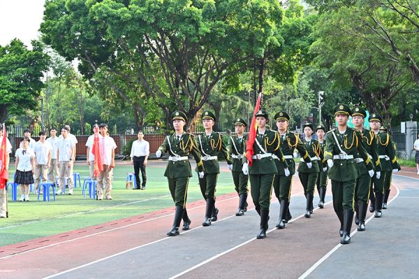雄壮的国歌声中,五星红旗冉冉升起,昂扬的旋律激荡起青年心中炽热的爱国情怀。广州奥林匹克中学校长葛红霞在致辞中以“胸怀家国、勇担使命”殷切寄语学子,勉励他们将个人理想融入国家发展的宏伟蓝图。随后,学校语言艺术团献上主题表演《少年传承志 共筑湾区梦》,展现了新时代湾区青年矢志报国的精神风貌。