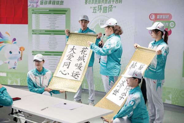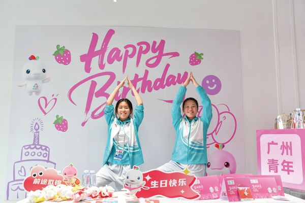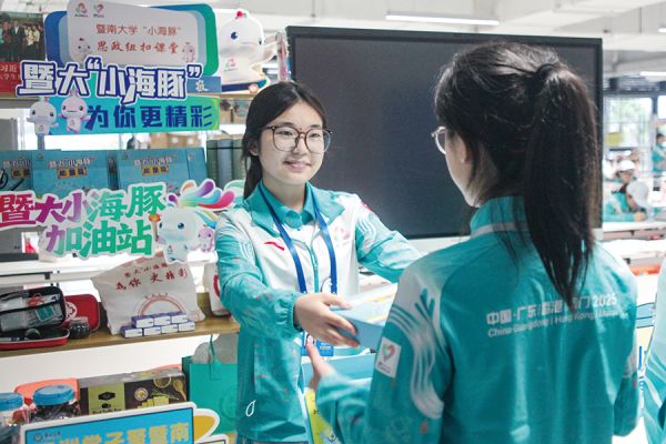 暨南大学为“小海豚”特别定制的“能量盒”、中医学院的驱蚊香囊、艺术学院的“四海同心”挂件、香港科技大学广州分校带来吉祥物“红鸟日晷”……这些特色物品与一整面满载回忆的照片墙和“打call墙”相得益彰,共同搭建起一座文化交流的桥梁,让志愿者们得以在此分享多元文化、倾诉志愿历程中的难忘记忆,于赛场之畔寻得强烈的归属感。