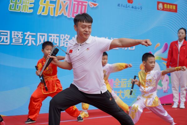 双节棍世界冠军吕一杰叔叔的表演太震撼啦!棍影如风,还翻了帅气的后空翻,全场掌声差点掀翻操场。活动后,他手把手教大家握棍、挥棍,还寄语大家:“坚持运动,你们也能成为自己的冠军,为十五运添活力!”