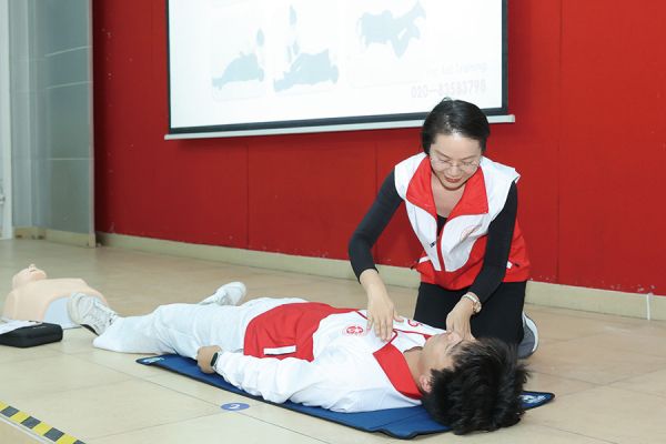 志愿者在岗前培训中学习应急救护助人技能