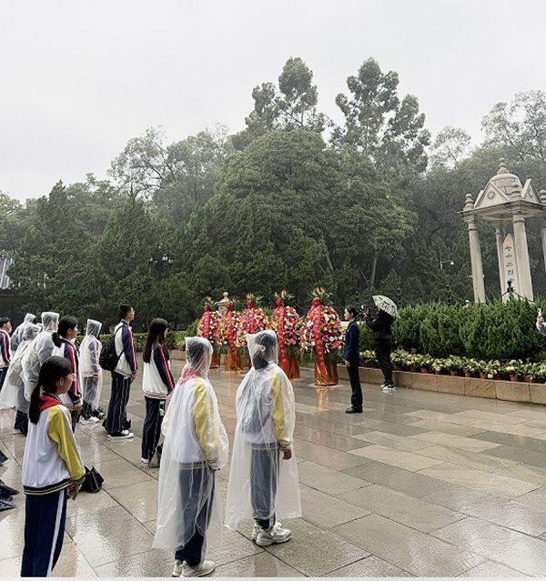 在黄花岗七十二烈士墓园内,300余位师生与家长一同缅怀逝去的同胞,致敬不朽的英烈。雨点敲在伞面上,顺着睫毛滑落,仿佛天空也在无声垂泪。