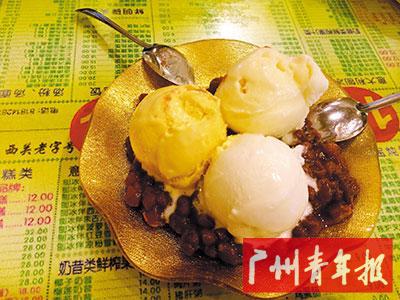 今年60岁的何伯是一名土生土长的广州人,他点了一份红豆冰配雪糕球,一边吸着冰水嚼着红豆,一边感叹着酷暑天气。何伯告诉记者,旧时没有空调,连电风扇都是奢侈品,所以每逢酷热天气,街坊都喜欢到冰室去“饮冰”降温。“上世纪七十年代,广州有阳光、皇上皇、美利权、顺记四大冰室。可以说是消暑圣地,东西又不贵,一杯红豆冰就陪着度过一个酷热的下午。”“堂吃是用高脚玻璃杯盛装,有雪球、冰沙、刨冰、冰饮等好多款式。”在荔湾长大的70后李先生向记者回忆道。