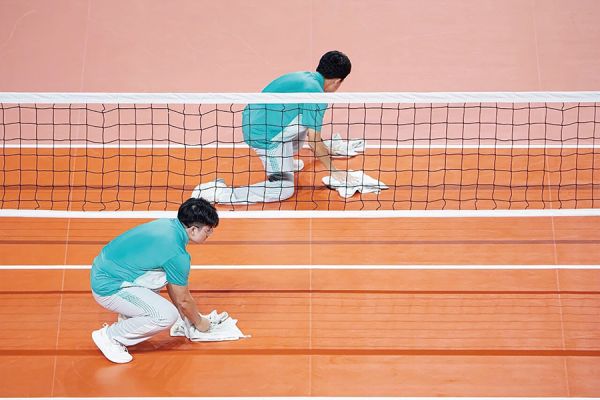“预备——冲刺——擦!”每当场中哨声响起,数道绿色的身影手持抹布冲入场内,迅速擦干地面的汗渍。他们便是“快擦手”志愿者。他们需要与时间赛跑。一场比赛下来,“快擦手”要往返奔跑工作数十次,比赛结束时早已汗流浃背。