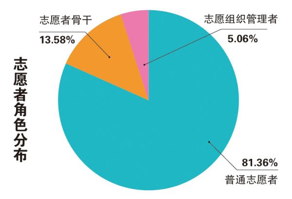 从青年志愿者在志愿服务组织中承担的角色来看,81.36%的受访者是普通志愿者,主要负责参与和执行志愿服务;13.58%的受访者是志愿者骨干,主要负责策划和组织志愿服务活动;5.06%的受访者是志愿组织管理者,主要负责统筹和管理志愿组织的整体工作。