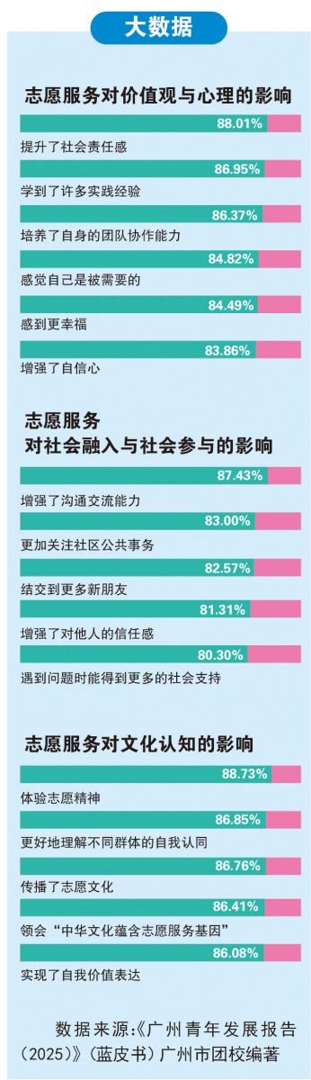 开栏语:日前,由广州市团校编写出版的《广州青年发展报告(2025)》(蓝皮书)发布,在全景描绘广州青年发展现状的同时,聚焦青年群体关键需求,涵盖大学生思想动态、青少年身心健康、大龄未婚青年婚恋观、青年志愿者成长、网约车司机生存发展、新职业青年现状、青年休闲旅游偏好、青年人才入乡发展等重点领域,深度挖掘广州青年的期盼与收获。