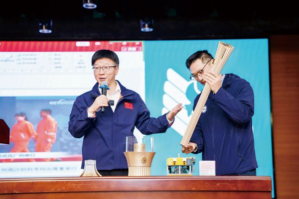 广州海洋地质调查局副总工程师沙志彬(左)揭秘十五运会“源火”采集原理
