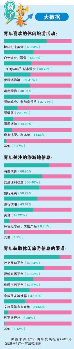 《报告》指出,作为全国首批青年发展型城市之一、在校大学生数量全国第一的城市,广州发展青年休闲旅游业态优势显著。但在此过程中,也存在青年休闲旅游配套设施有待完善、青年对新兴业态的需求未得到充分满足、休闲旅游产品与本地特色资源融合创新不足、休闲旅游宣传方式有待丰富等问题。