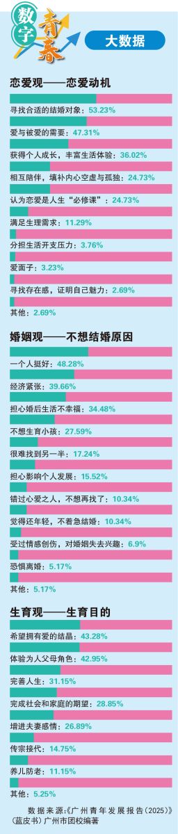 《广州青年发展报告(2025)》(蓝皮书)中刊发的《广州大龄未婚青年婚恋观研究》以广州大龄未婚青年为研究对象展开调查,共回收有效问卷453份。恋爱观方面,当下青年恋爱动机多元,婚姻导向与情感需求居于核心;婚姻观方面,经济压力是当代青年“恐婚”的首要原因;在生育观上,情感价值与自我实现的意义则更为突出。
