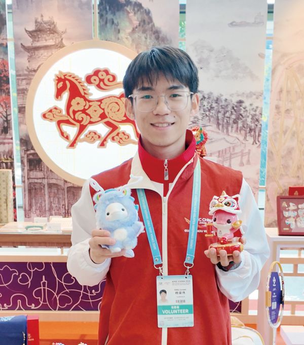 杨骏伟:我负责“广州礼物”展区,这里最受欢迎的是醒狮和十五运会和残特奥会吉祥物。为了让外宾更好理解,我利用工作之余积极学习,主动丰富语料库,以向外宾更好地介绍吉祥物的设计寓意。这次经历也让我学到了更多涉外礼仪,收获颇丰。