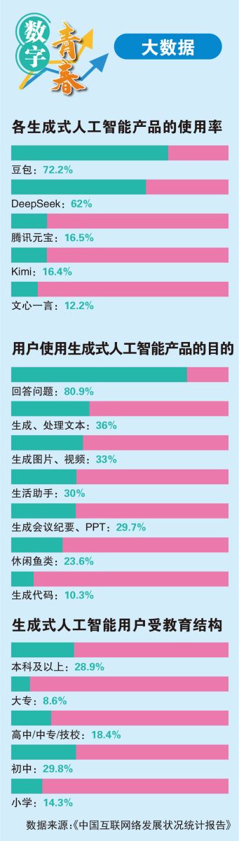 职场白领黎女士在白天工作中打开电脑,AI辅助完成报表;深夜躺在床上,AI生成的短视频填满屏幕。她坦言:“现在的生活,走到哪里都绕不开AI。”现如今,生成式人工智能正以前所未有的速度渗透至生活和生产的各个层面。对青年群体而言,这种渗透呈现出鲜明的场景化、工具化与创意化特征。他们不再只是技术的被动接受者,更是积极的应用者与共创者。