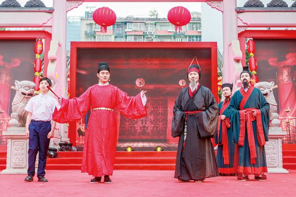 越秀区文化馆、广汉会与小风铃艺术团以“古今穿越”为创意核心,联袂带来情景表演《时光漫游广州城》:唐代书生崔炜意外与现代小学生嘉嘉结伴踏上溯源之旅。从秦朝番禺城赵佗将军筑城拓土的豪迈现场,到三国东吴刺史吕岱定名“广州”的历史时刻,演员们用沉浸式演绎让观众在时空穿梭中触摸广府文化的根与魂。