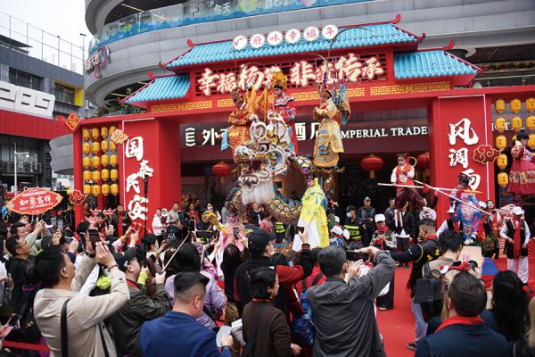 在梅花村街分会场,杨箕元宵非遗系列活动热火朝天。八音齐鸣、龙狮献瑞、财神送福、太极神韵、“回娘家”及灯笼方阵等轮番登场,各具特色,将广府民俗的灵动与温情展现得淋漓尽致。更有特邀而来的潮汕英歌舞、吴川飘色、中国木偶、川剧变脸和从化水族舞等国家级、省级非遗项目惊艳亮相,不同地域的文化风情在杨箕街头交相辉映,为元宵民俗活动增添了别样韵味。