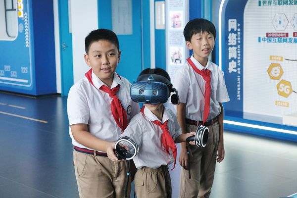青少年在广州市未成年人网络生态治理基地体验VR设备,学习网络安全知识 陈天旭/摄