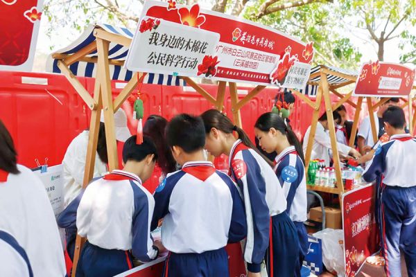 红棉潮墟特设助农摊位,蓝莓、莲藕等南沙特色产品琳琅满目,成为“百千万工程”助力乡村振兴的生动缩影,在一买一卖间展示城乡融合的温度;广东空天科技研究院的科学实验秀,引得孩子们惊叹连连;广州市科学技术协会的科普大篷车则化身为移动科技馆,VR体验、机器人表演、电磁奥秘探索等互动展品,让青少年亲手触摸科学原理,感受物理世界的神奇。植树现场还同步举办了以红棉文化为主题的趣味游园活动,“木棉科普讲堂”讲述英雄树的物候奥秘,“木棉艺术共创坊”让孩子们挥洒创意,“地球呼吸树艺术展”则以童趣视角传递绿色环保理念。