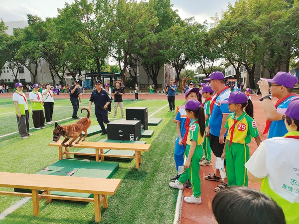 活动现场,广州市公安局番禺分局带来的警犬技能展示点燃全场热情。身手矫健的马努里阿犬、嗅觉敏锐的寻血猎犬、温顺友善的拉布拉多犬轮番亮相,专业又可爱的模样,让在场学生目不转睛、欢呼不断。随后,从“破冰启航”的分组结对,到“我们一起来挑战”系列任务的逐一展开,每一项活动都精心设计,旨在激发队员们的潜能,促进他们之间的交流与合作。
