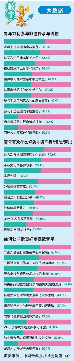 调查表明,年轻人参与非遗传承与传播的方式多样化——60.5%的受访青年喜欢观看非遗主题演出或展览,53.5%的受访青年会购买和使用非遗相关产品,46.0%的受访青年会在社交媒体上分享和推广,41.9%的受访青年会尝试学习并掌握某项非遗技艺,40.6%的受访青年想从事非遗相关的创业或工作,40.4%的受访青年对参与非遗与现代文化的跨界合作感兴趣,38.1%的受访青年想参与非遗主题的志愿活动,21.4%的受访青年愿意为非遗项目进行众筹或捐赠,20.7%的受访青年会向家人朋友推荐非遗体验。