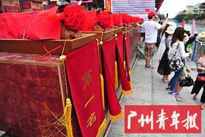“行外人看输赢,行内人看技巧。”车陂村龙船协会相关负责人介绍,比赛过程中,扒手们由开始坐在龙舟上扒,到跪着扒,再到站着扒,以求动作加快。比赛方式来回300米,在单程折返时,龙舟需要完成拿旗任务,“拿旗听似简单,却对每支队伍的比赛成绩起着关键作用,最前面负责拿旗的队员,什么时候给打鼓的人做手势让划桨停下来,这个很重要,因为划桨的人停太快,前面的就拿不到旗,如果停得过慢,龙船又过头了,这样一来很费时间。所以,‘恰到好处’是一门技巧。”