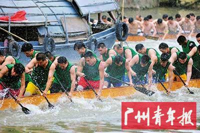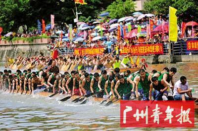 从四月下旬到五月初五是赛龙船的高潮,各个村互相走访,举行竞渡,得胜者可获赏全只烧猪。之后到五月中旬重新埋龙舟,前前后后要历时一个多月。“在我们这里,端午比春节还热闹”,车陂村刘婆婆的话代表了不少广州村落居民的心声。