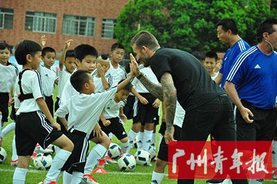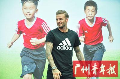 本报讯(记者 周司琪 摄影 劳晖森)贝克汉姆来广州了!昨日上午,英国著名足球明星贝克汉姆现身广州执信中学,参加阿迪达斯校园足球活动,助力全国2万所足球特色学校的2千万名学生学会踢足球并终身受益。