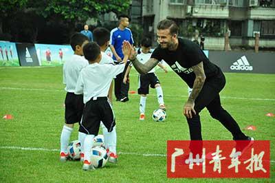 6月28日上午,英国著名足球明星贝克汉姆现身广州执信中学,参加由广州市教育局指导的阿迪达斯校园足球活动。现场,来自广州市海珠区后乐园街小学的30名学生与贝克汉姆进行了足球互动。期间,教育部全国青少年足球办公室技术顾问、亚洲最受尊敬的青少年足球教练之一汤姆•拜耳,还对学生们进行了三十分钟的强化训练,让他们既学习了足球技能又学会享受足球这项运动。