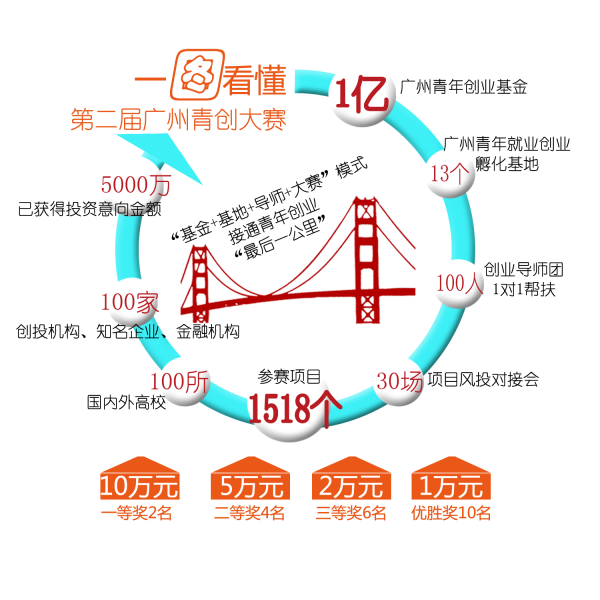 第二届广州青年创业大赛以“创业落地扶持”为办赛宗旨,建立了完善的具有广州特色的“大赛+基地+基金+导师+培训”办赛模式;以创业大赛为平台,通过建立创业大赛投资联盟、设立规模1亿元广州青年创业基金、联合共建13个青年就业创业孵化基地、组建创业导师团140人、建立创新工作坊及创业学院等途径,搭建起贯穿“创意—项目—孵化—产出—推广”全流程的青年创业服务体系;打造青年创新创业生态链条,吸引国内外青年来穗创业、落地孵化,接通青年创业“最后一公里”。