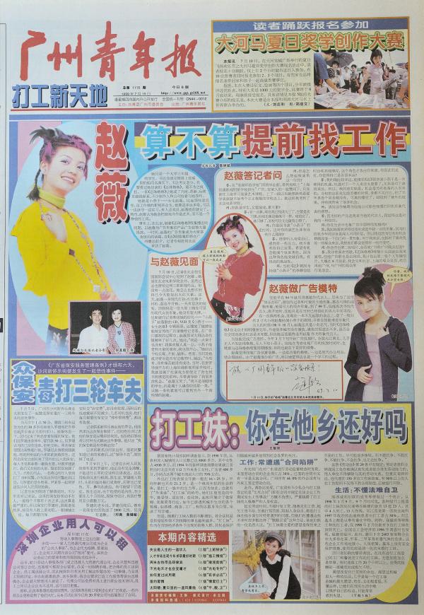 为避免报道的同质化,我们将目光更多地投向关注青年朋友的学习、毕业、就业、职场等方面的阅读需求,分别做了《赵薇算不算提前找工作》和《“小燕子”秘密飞来广州“炒更”》两篇报道,这样更贴近当时报纸的内容定位。