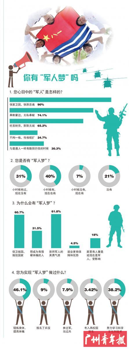 为了了解广州青年的军人情怀,本报特别发起“你有过军人梦吗”的微调查,总共回收数百份有效调查问卷。在调查和采访过程中发现,78% 的广州青年表示,有或曾经有过军人梦,其中 40% 的人承认“现在还有军人梦”。