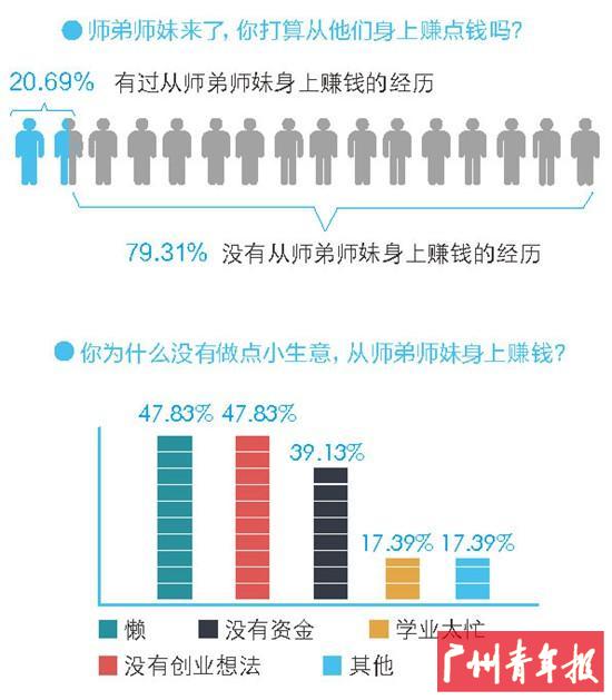 一大批小鲜肉来袭,让多少人动了心思,打起了小买卖的主意?根据调查问卷数据显示,七成的大学生表示不打算加入商战行列。面对烧钱不手软的准大学生,师兄师姐却显得捉襟见肘。数据反映,39.13%的人之所以不在迎新季做点小生意,是因为缺乏充足的资金,而靠从学费和生活费中省下来的钱,难以杀出一条大道来。但因为懒或没有创业想法的人也不在少数,有47.83%的投票率,在新生报到前,就要忙着进货、挑选、上门推销或摆摊出售,忙前忙后,都不能好好开个学,精力都耗费在这上面了。根据调查,只有20.69%的人表示有过从师弟师妹身上赚钱的经历。