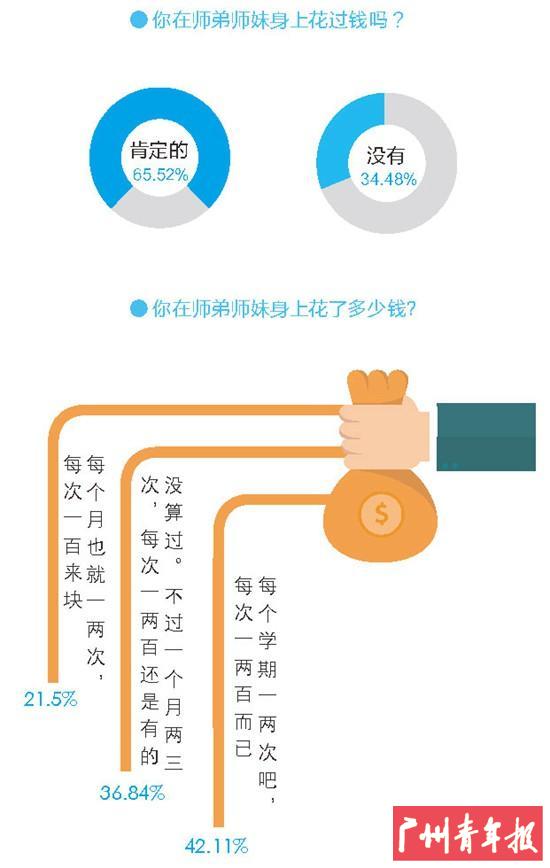 况且,为迎接小鲜肉,师兄师姐少不了跟他们聚餐、游玩联络感情,这时候花点钱是难免的。65.52%的人表示曾在师弟师妹身上花过钱。其中,8.42%是因为社团迎新聚会,作为社团的前辈,迎来社团的新血液前花点血本可是不变的传统。其次是仅仅作为师兄师姐的身份,请新来的小鲜肉们吃一顿互相认识也十分必要。而目的是撩妹/弟排在第四位。