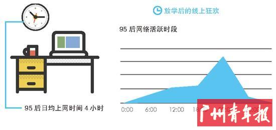 95后可以真正被称为互联网的一代。相比于90后的懵懵懂懂,95后所成长的互联网环境更加成熟。他们在互联网中如鱼得水,也对互联网有更多依赖,呈现出许多个人与网络交织的特征。2015 年2 月发布的《芬达“95后”橙皮书》调查显示,六成的95后患有严重的手机依赖症。日均上网时间4小时,夜里10点前后更是使用互联网高峰。